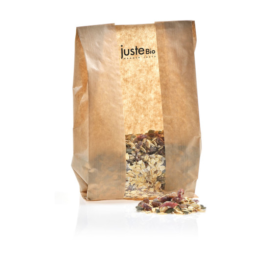 Ingrédients : Flocons d'AVOINE*, raisins* 15% (raisins* 99.5%, huile de tournesol*), canneberges* 15% (canneberges* 60%, sucre*, huile de tournesol*), graines* 30% (graines de courge*, graines de tournesol*, graines de lin*) * produit issu de l'agriculture biologique - Certifie par FR-BIO-01 Traces éventuelles de fruits à coque, d'arachides, de graines de sésame, d'autres céréales contenant du gluten, de soja et Moutarde