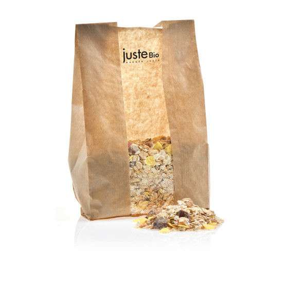 Ingrédients: Flocons de céréales complètes* 61,8% (AVOINE complet* 31,2%, EPEAUTRE complet* 15,3%, BLE complet* 15,3%), pétales de maïs* 11,5%, raisins secs* 10% (raisins* 99,5%, huile de tournesol*), dattes séchées* 7,6% (dattes* 92,5%, farine de riz*), bananes chips* 5,3% (bananes* 68%, huile de noix de coco*, sucre*), pommes déshydratées* 3,8%. * produit issu de l'agriculture biologique - Certifie par FR-BIO-01 Traces éventuelles de fruits à coque, d'arachides, de graines de sésame, d'autres céréales contenant du gluten, de soja et de lait.