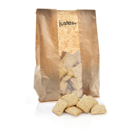 Ingrédients : Pâte à tartiner à la NOISETTE et au cacao* 40% (sucre*, NOISETTE* 16%, huile de colza*, poudre de LAIT écrémé*, poudre de cacao maigre* 7%, émulsifiant : lécithine de tournesol*), semoule de maïs* 22.1%, semoule de BLÉ complet* 20.2%, sucre de canne* 8.4%, son de BLÉ* 7.1%, flocons d'AVOINE* 1.6%, sel. * produit issu de l'agriculture biologique - Certifie par FR-BIO-01 Traces éventuelles d'autres fruits à coque, d'arachides, de graines de sésame, d'autres céréales contenant du gluten, de soja.