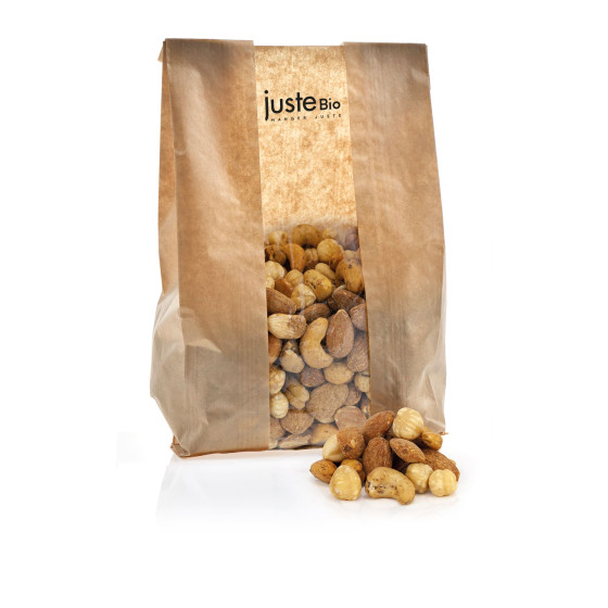 Ingrédients : NOIX DE CAJOU et AMANDES grillées salées poivrées* (NOIX DE CAJOU*, AMANDES*, sel 2%, poivre noir moulu* 1,1%, poivre blanc moulu* 0,9%), NOISETTES émondées grillées* * produit issu de l'agriculture biologique - Certifie par FR-BIO-01 Traces éventuelles d'autres fruits à coque, d'arachides, de graines de sésame, de céréales contenant du gluten, de soja, de céleri et de moutarde.