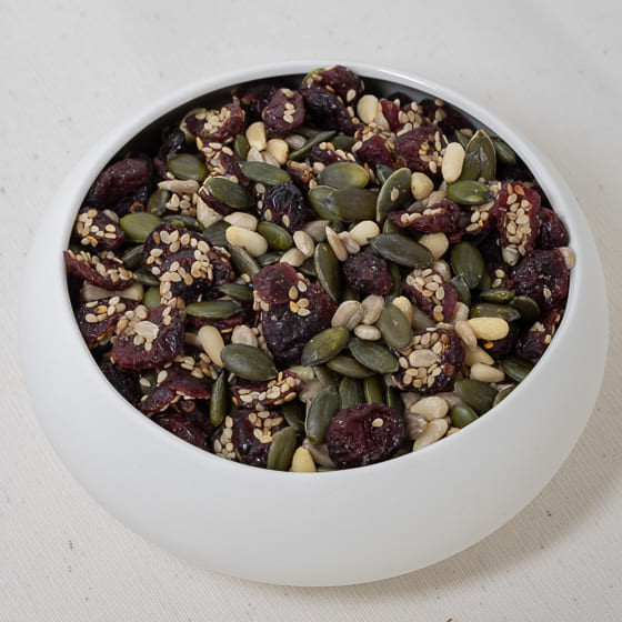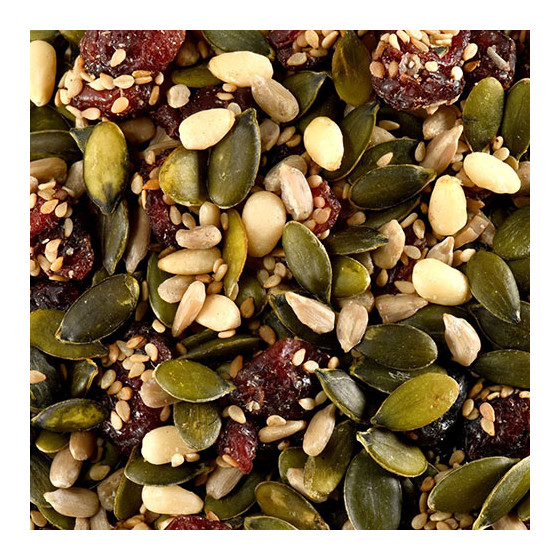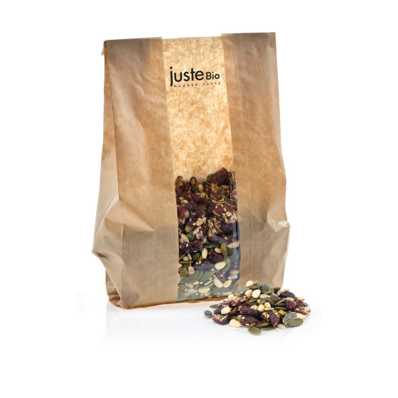 Ingrédients : Canneberges* (canneberge* 60%, sucre*, huile de tournesol*), graines de courge décortiquées*, graines de SESAME complet*, graines de tournesol décortiquées*, pignons de pin*. * produit issu de l'agriculture biologique - Certifie par FR-BIO-01 Traces éventuelles de fruits à coque, d'arachides, de céréales contenant du gluten, de soja.