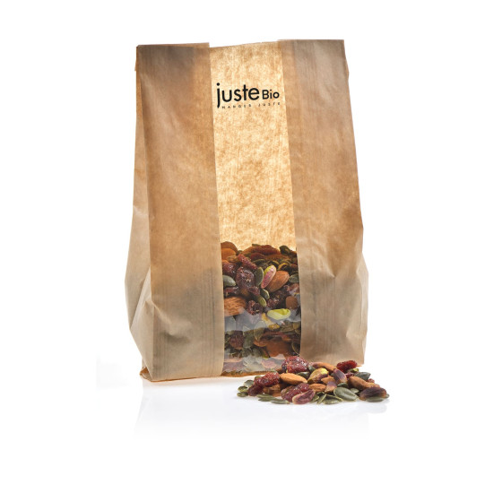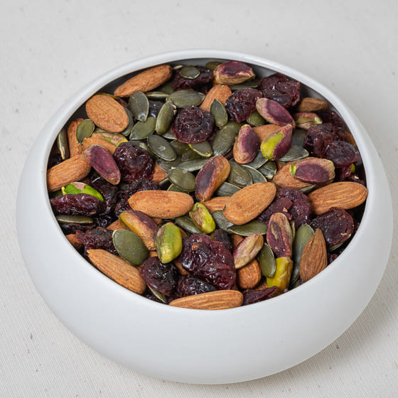 Ingrédients : Canneberges* (canneberges* 60%, sucre*, huile de tournesol*), AMANDES*, graines de courge*, PISTACHES*. * produit issu de l'agriculture biologique - Certifie par FR-BIO-01 Traces éventuelles d'autres fruits à coque, d'arachides, de graines de sésame, de céréales contenant du gluten, de soja.