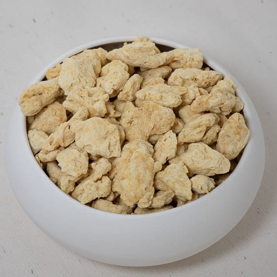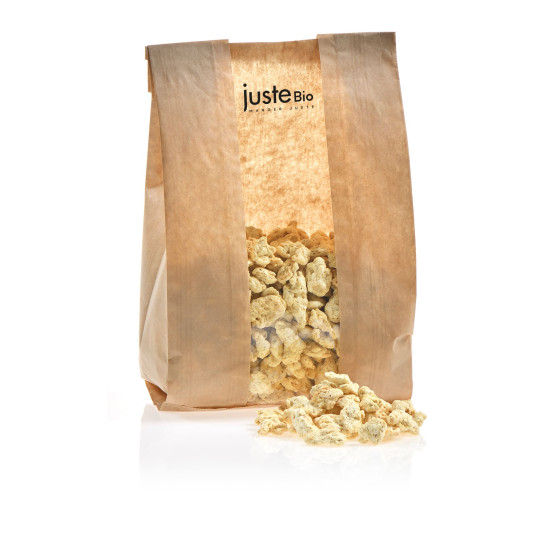 Alternative végétale dans vos plats. Réhydrater 1 volume de protéine pour 2-3 volumes d'eau ou de bouillon. Porter à ébullition pendant 15 min puis le cuisiner. À conserver dans un endroit frais et sec.
