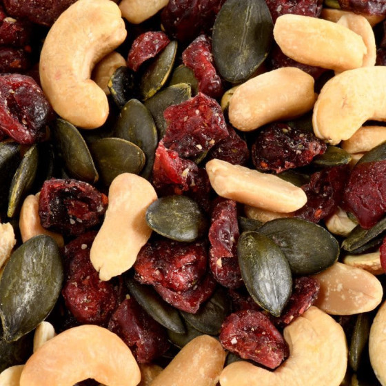 Ce mélange innovant et savoureux allie des notes sucrées et salées , grâce aux cacahuètes grillées salées, noix de cajou grillées, cranberries et graines de courge